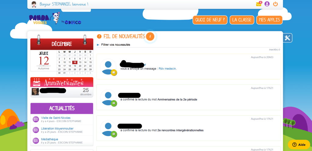 La page d’accueil centralise l’essentiel de mes activités : qui m’a envoyé un mail ? Qui a signé le cahier de liaison ? Qui fête son anniversaire ? Quelles sont les actualités, les activités prévues ?