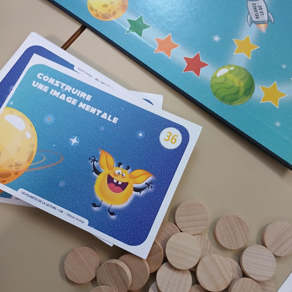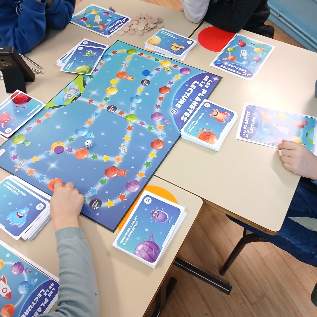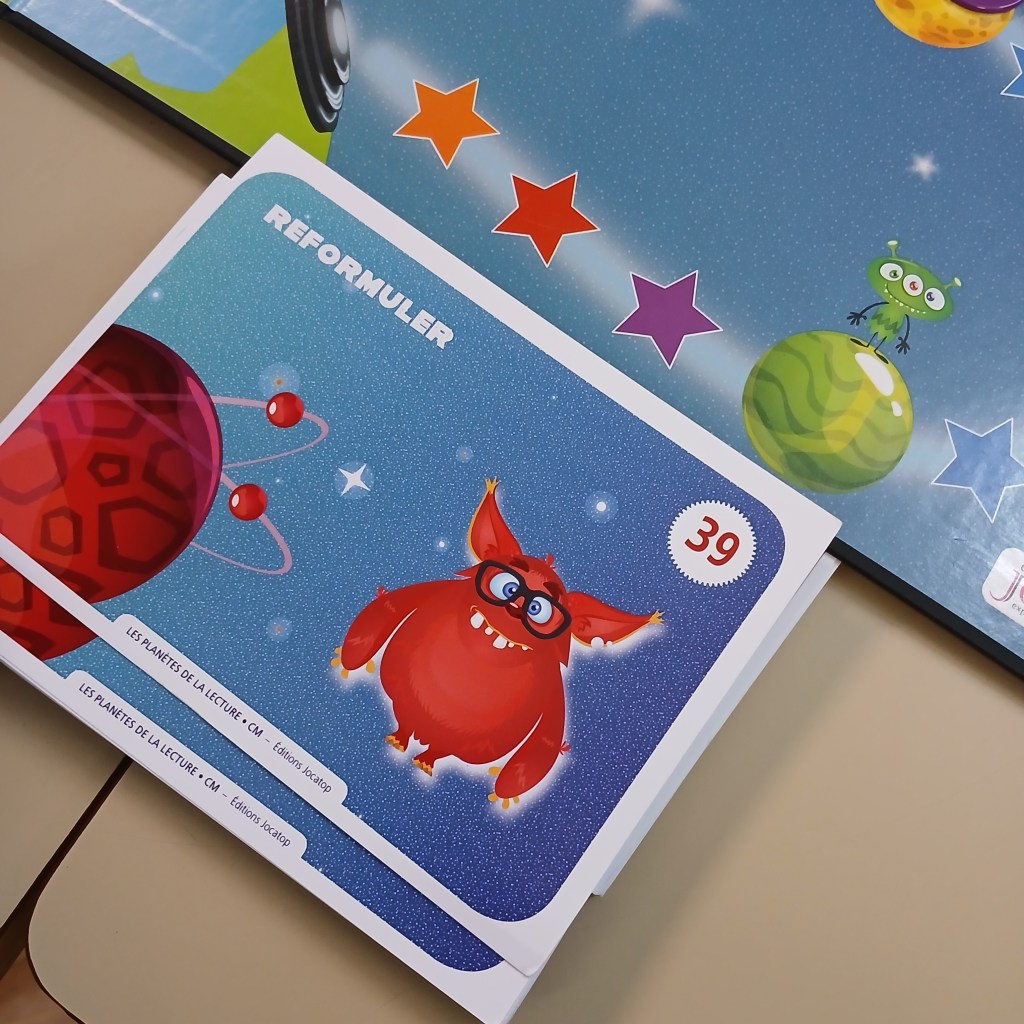 Sur le principe du Trivial Poursuit, ce jeu allie stratégie, patience et compétence de lecture. Les élèves apprennent à lire l’implicite et l’explicite, à reformuler, à lire avec intonation … Si moi, je préfère « Ton compte est bon … Terrien ! », les élèves ont jeté leur dévolu sur celui-ci. Leur couleur préférée : la jaune, construire une carte mentale.