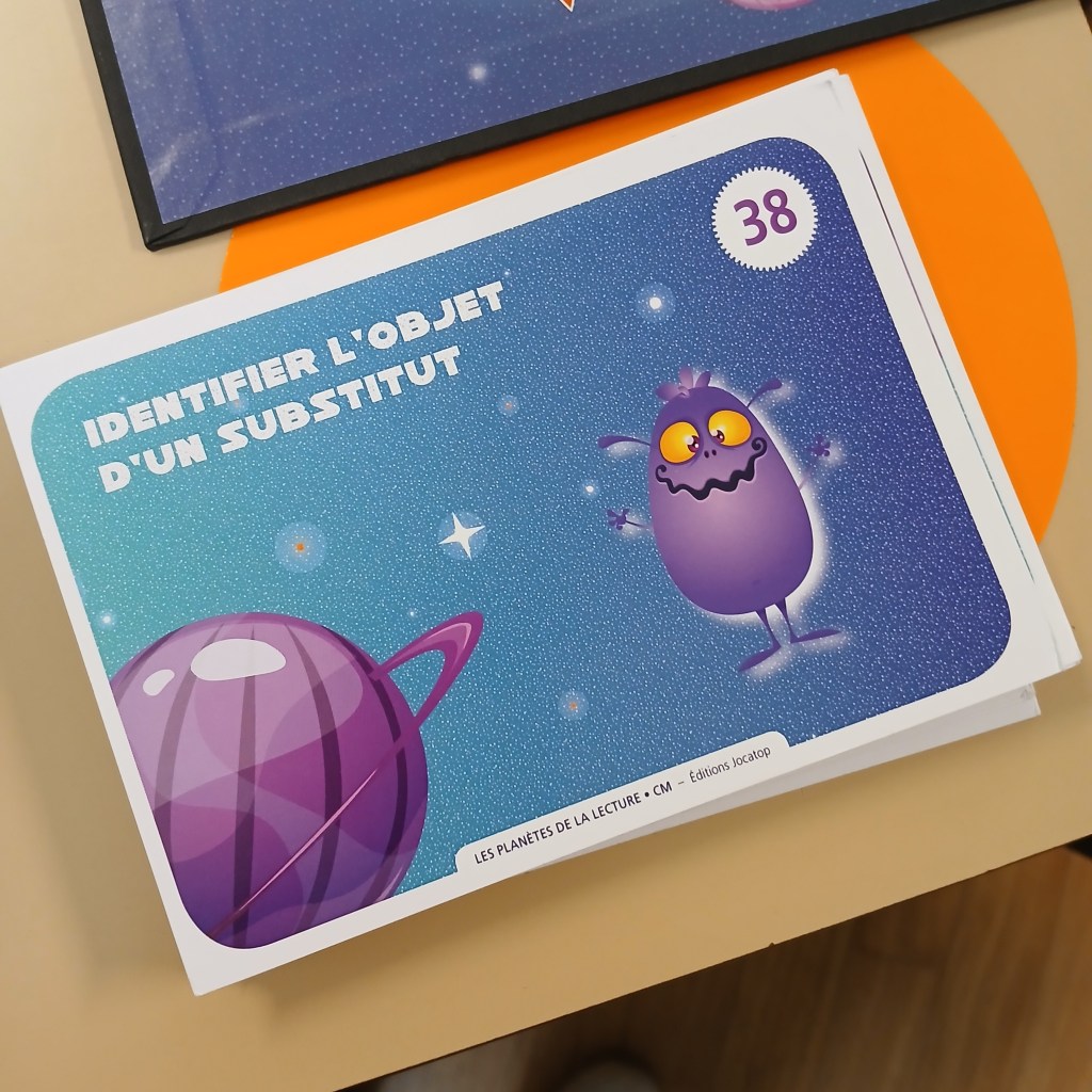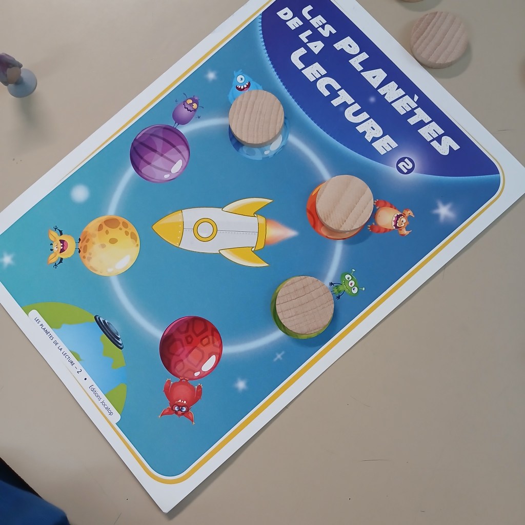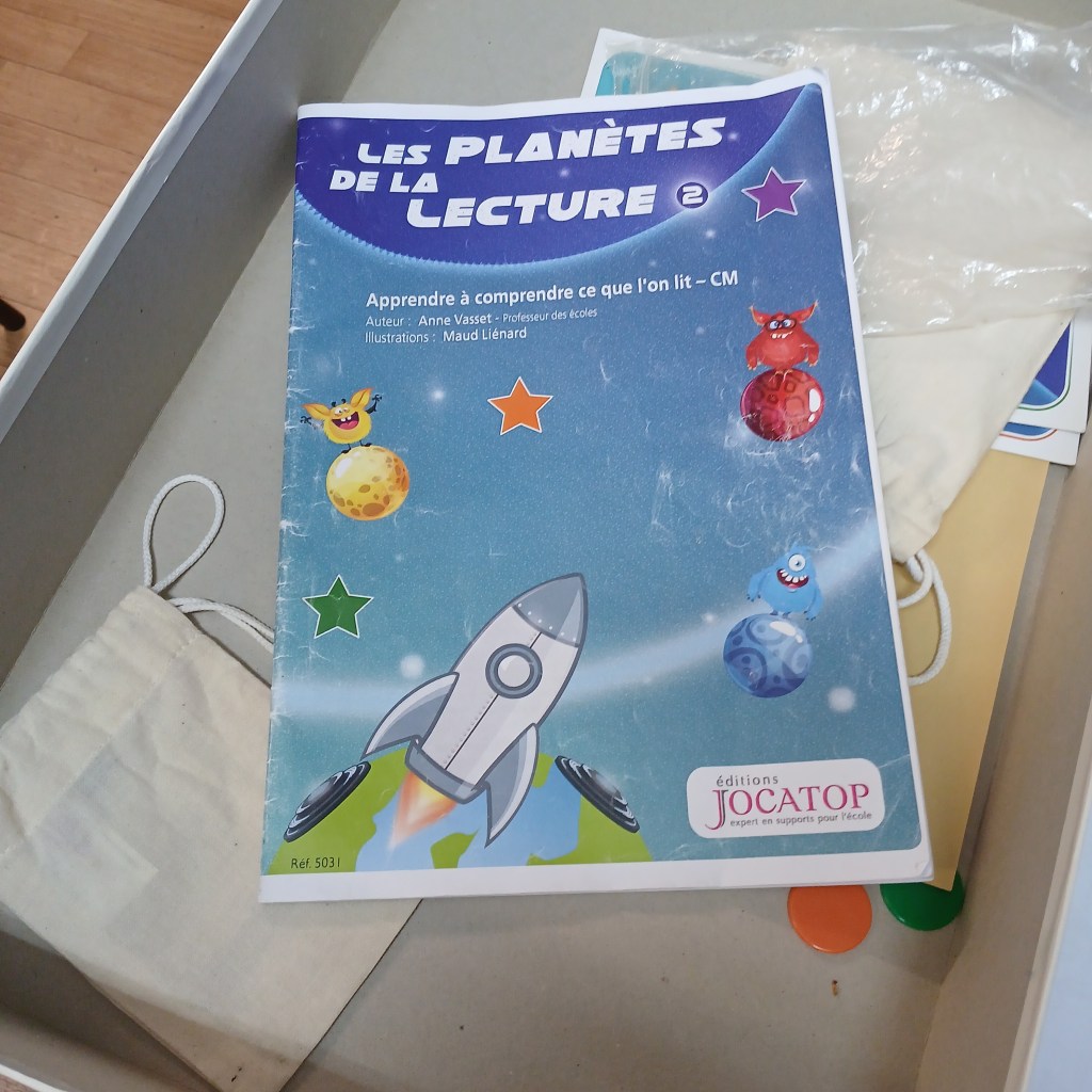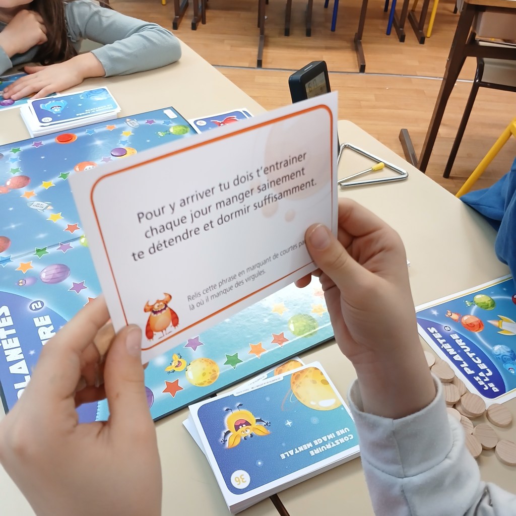 Sur le principe du Trivial Poursuit, ce jeu allie stratégie, patience et compétence de lecture. Les élèves apprennent à lire l’implicite et l’explicite, à reformuler, à lire avec intonation … Si moi, je préfère « Ton compte est bon … Terrien ! », les élèves ont jeté leur dévolu sur celui-ci. Leur couleur préférée : la jaune, construire une carte mentale.