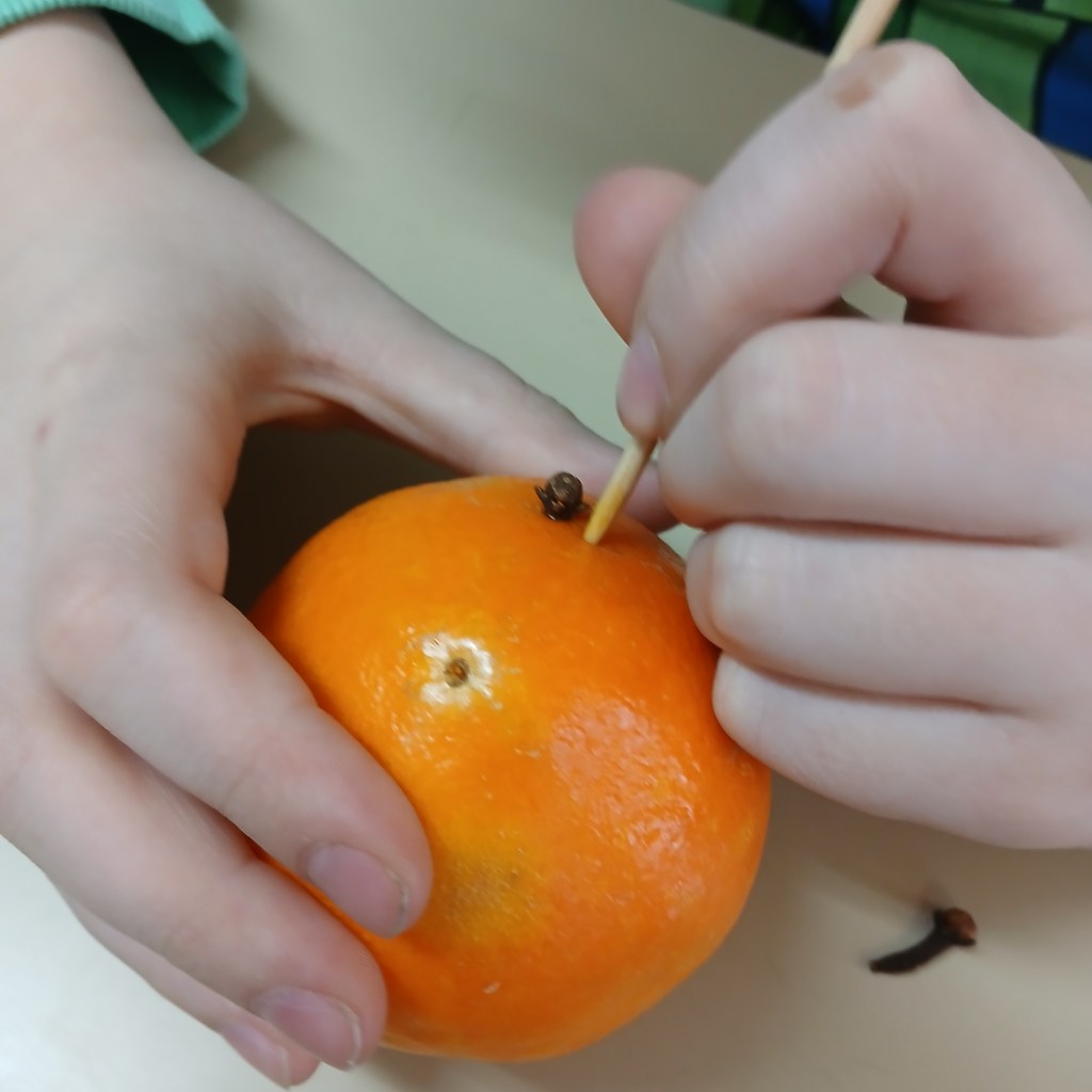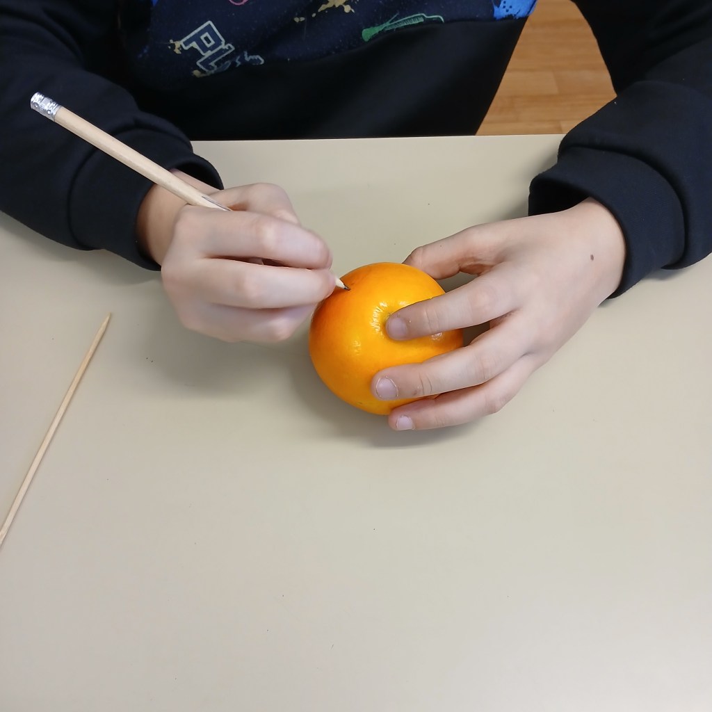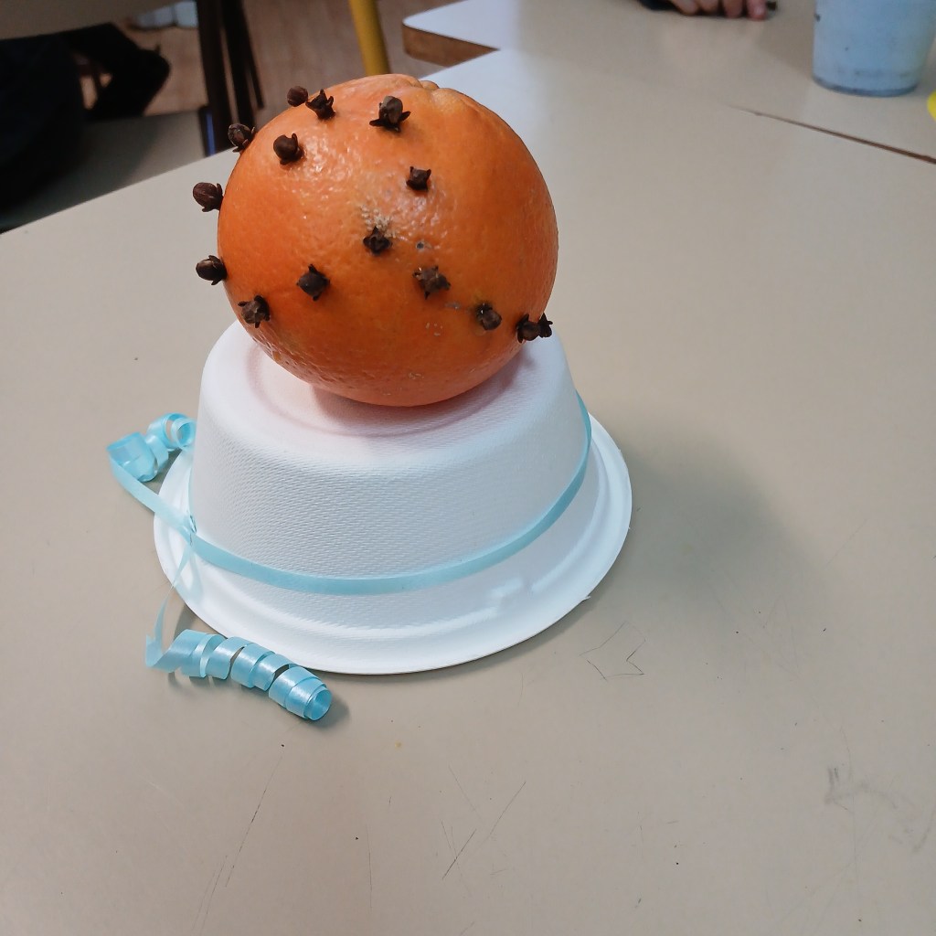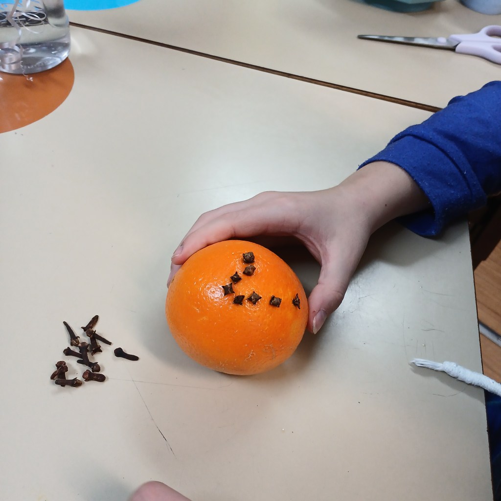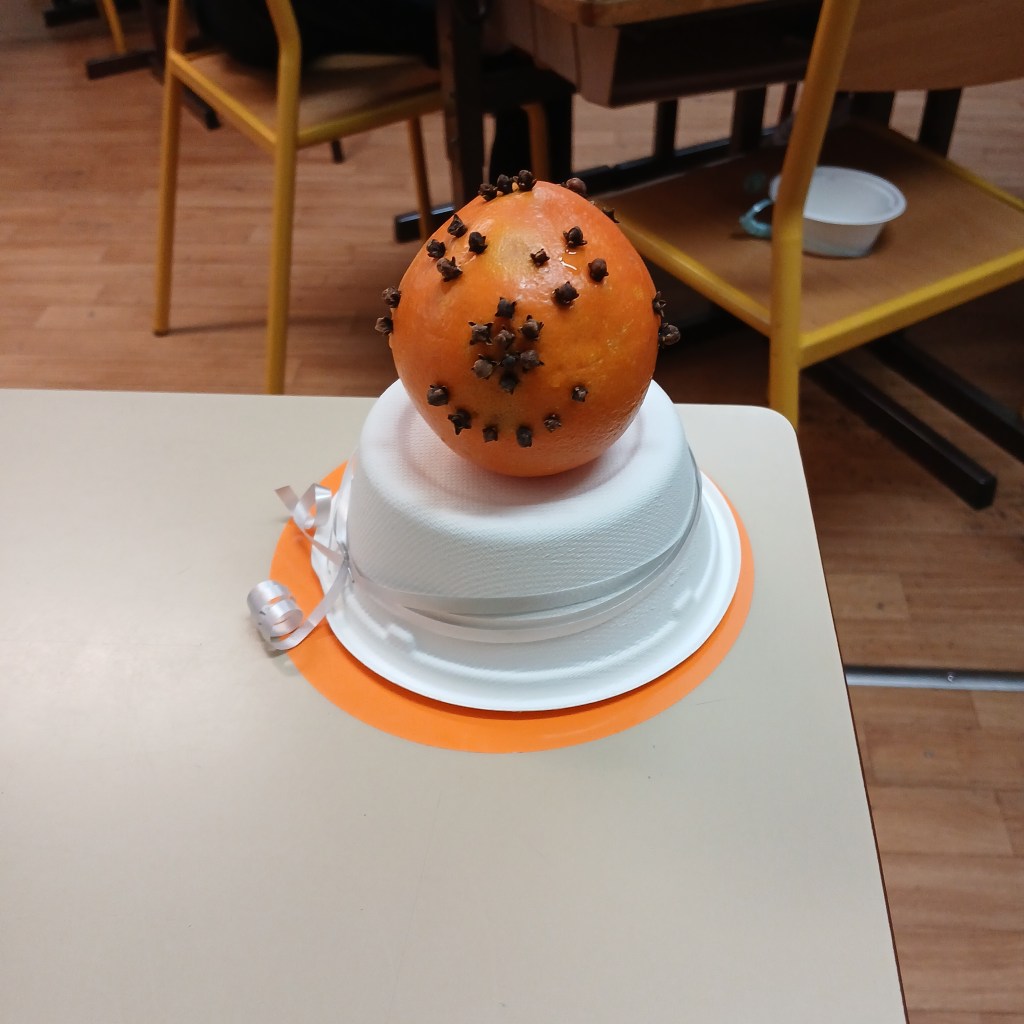 Le matériel par élève : une orange, un bout de Bolduc, un pic à brochettes et quelques clous de girofle. Je demande souvent aux élèves de ramener leur propre bocal.
