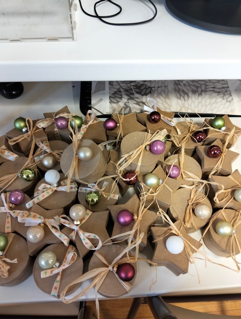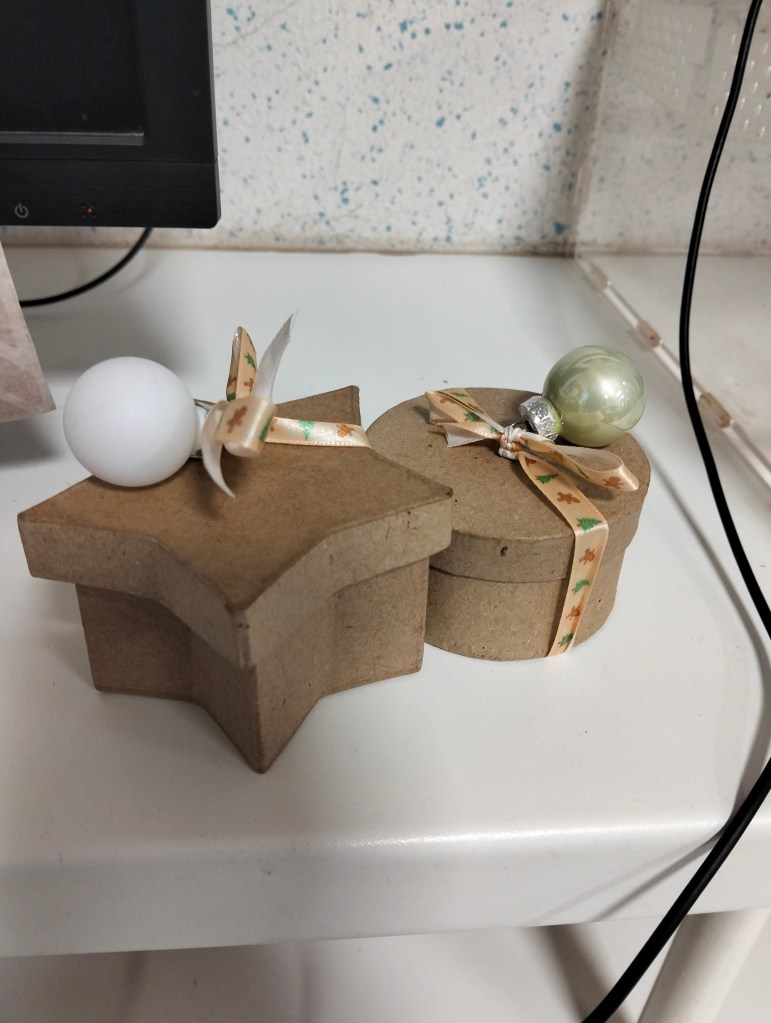 Un peu de raphia, quelques décorations de Noël, et chaque boîte devient un petit cadeau fait main, parfait pour le marché de Saint-Nicolas.
