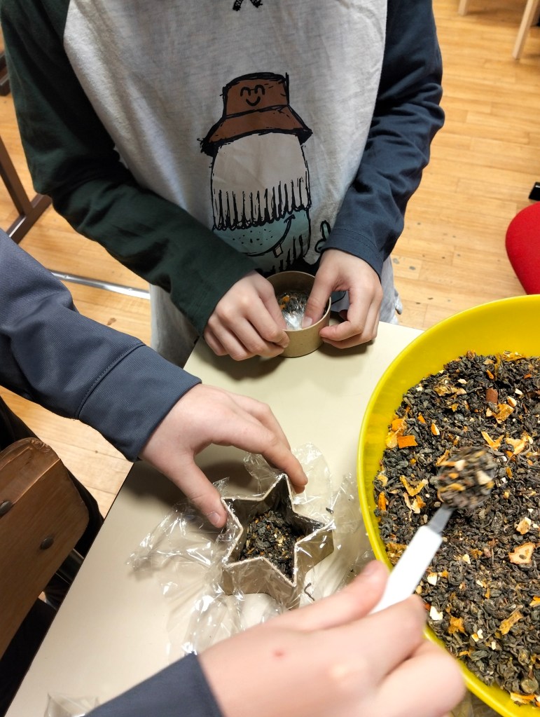 Nous avons ensuite mélangé l’ensemble au thé et tout placé dans une boîte hermétique pour laisser les arômes se diffuser.