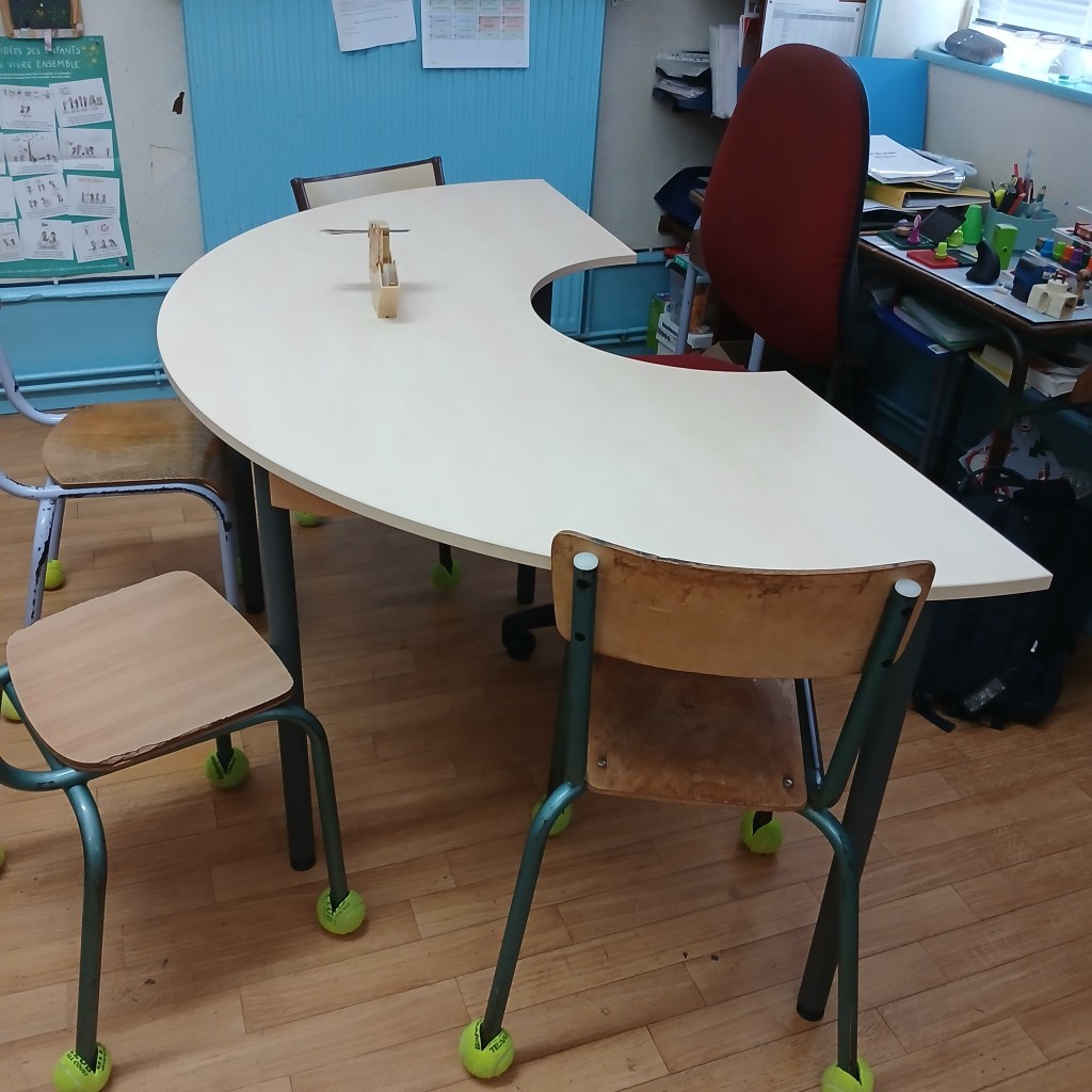 Du nouveau dans ma classe ! Aujourd’hui, 17 juin 2025. La sonnette retentit. Deux des ouvriers municipaux m’attendent avec un énorme sourire ! C’est Noël avant l’heure … J’avais émis le souhait d’une table en demi-lune, trouvé des modèles sur Internet et donné des cotes en me disant que peut-être un jour j’aurais une table sur mesure … Et bien ce jour est arrivé ! Aussitôt dit, aussitôt fait ! La table de correction a désormais une tout autre allure ! Il manque quelques jolis tabourets de couleur pour remplacer les antiquités qui servent de chaises et ça sera parfait !
