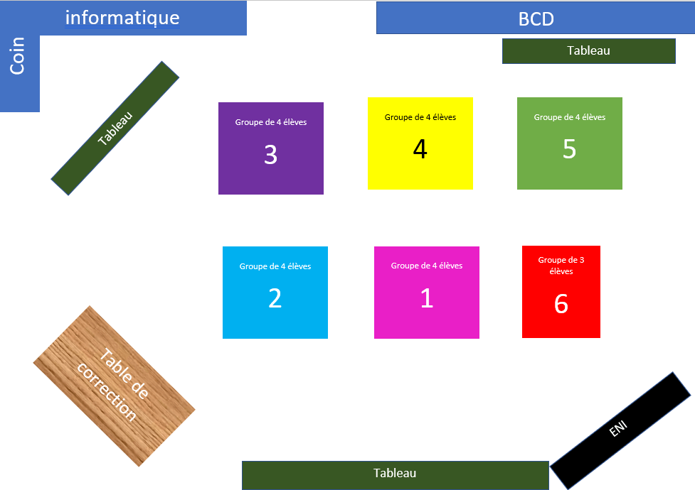 Après plusieurs essais, plus ou moins fructueux, l’organisation la plus efficace est celle des tables en T. Les élèves peuvent travailler en groupe car ils sont en face les uns des autres mais ils peuvent aussi travailler en classe entière sans besoin de se retourner.