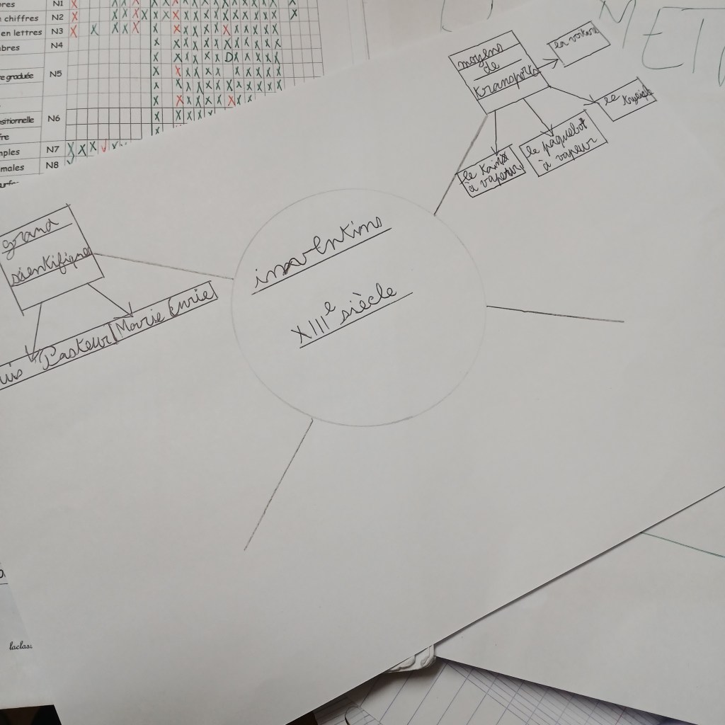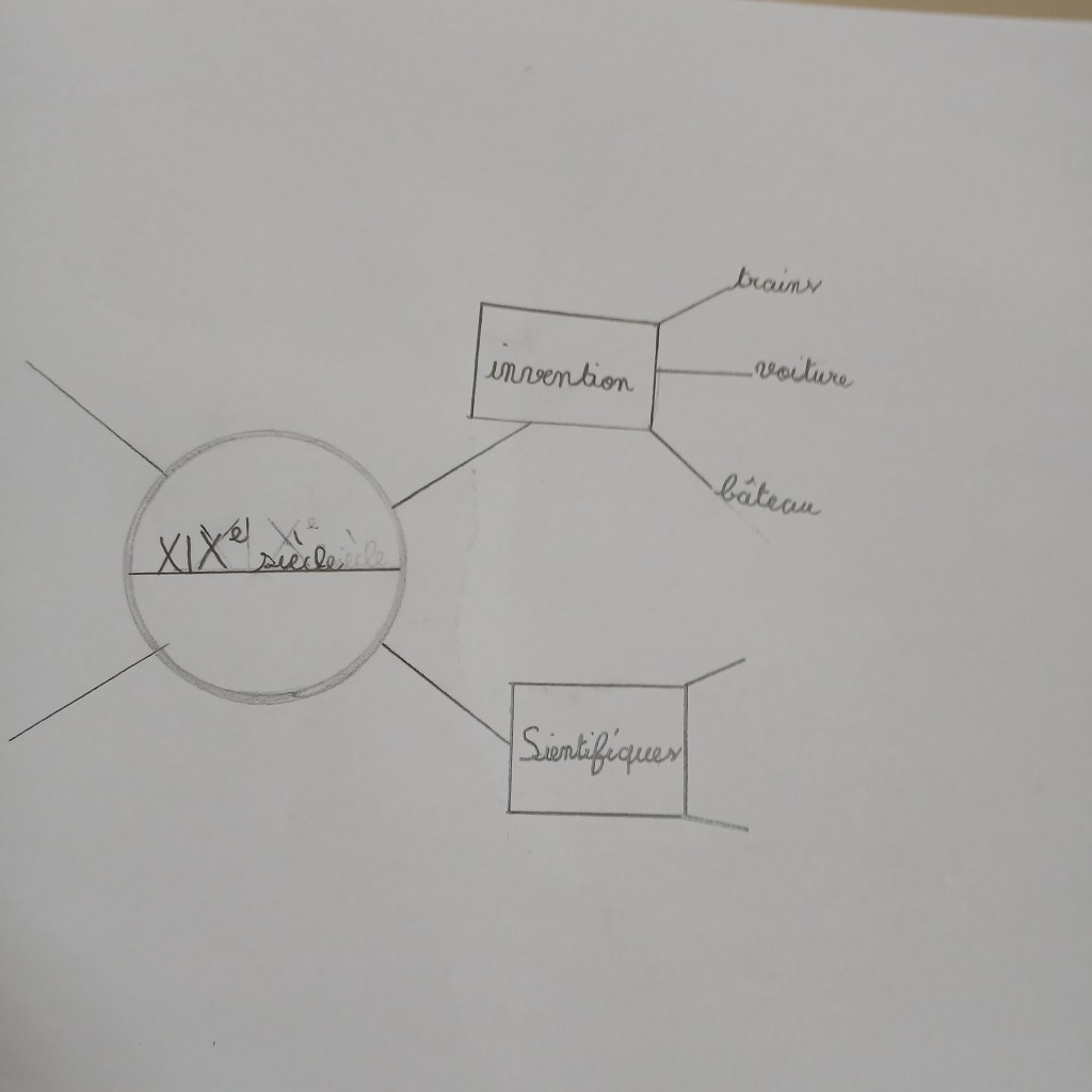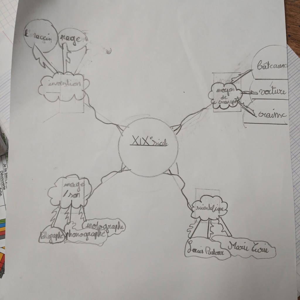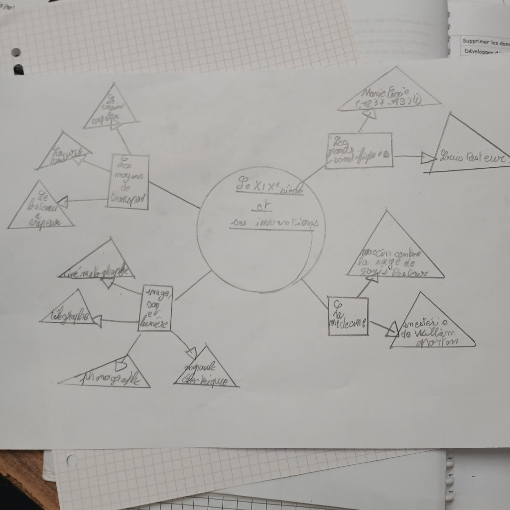 Les cartes mentales présentées ci-dessous ne sont ni finies ni corrigées. Elles concernent els grandes inventions du XIXe siècle. Là encore, certains ont l’esprit cartésien, d’autres sont des artistes en herbe et d’autres encore sont les deux. Ce petit mélange donne des cartes mentales assez similaires tout en étant propre à chacun :