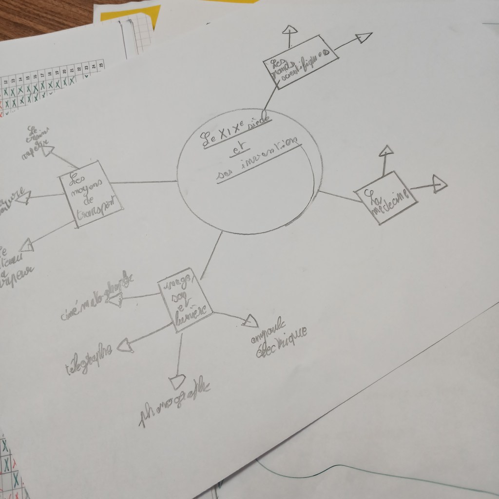 Pour l’élaboration de la carte mentale, je mêle travail en groupe et individuel. Chacun aura sa propre carte mentale mais aura pu soit construire la structure grâce à un modèle élaboré par le groupe, soit s’inspirer de la carte mentale de ses voisins pour créer la sienne, la compléter ou l’agrémenter.