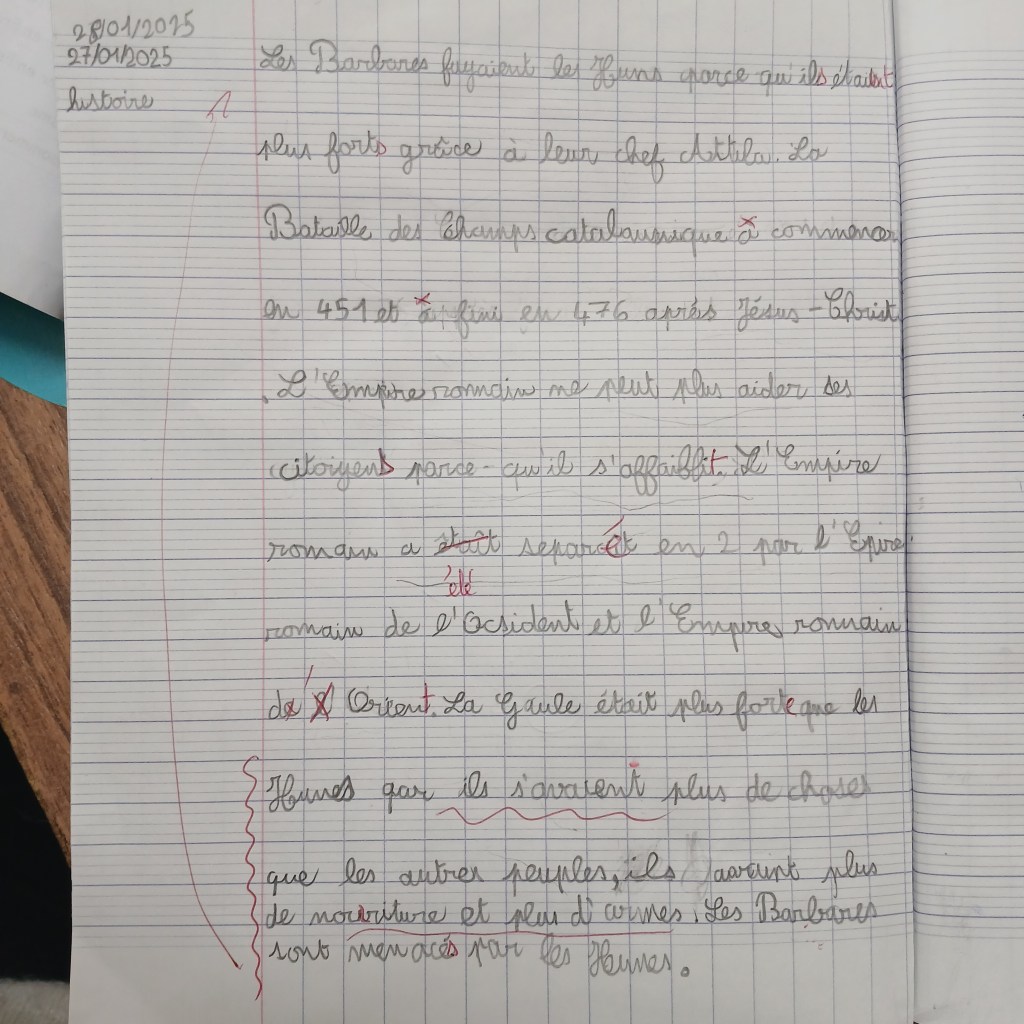 Dans l’exemple ci-dessous (les prénoms sont modifiés), un groupe de CM1 travaillait à la synthèse de la séance sur les grandes migrations du Ve siècle. C’est Lucie qui écrivait, car elle est très bonne en orthographe. Etienne et Lucien ont un esprit synthétique, ils ont encore des difficultés avec la syntaxe mais avait bien en mémoire les différentes réponses. Quant à Hélène, elle est plutôt douée en production d’écrits. Tous les quatre ont su joindre leurs efforts pour me proposer cette première ébauche :