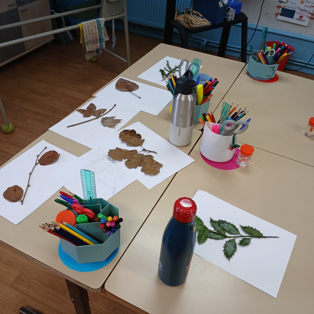 Il y a deux semaines, Sylvain, garde-forestier à l’ONF, était venu avec nous et nous avions parcouru la forêt à la recherche de feuilles et de rameaux qui nous avons mis à sécher sous presse.