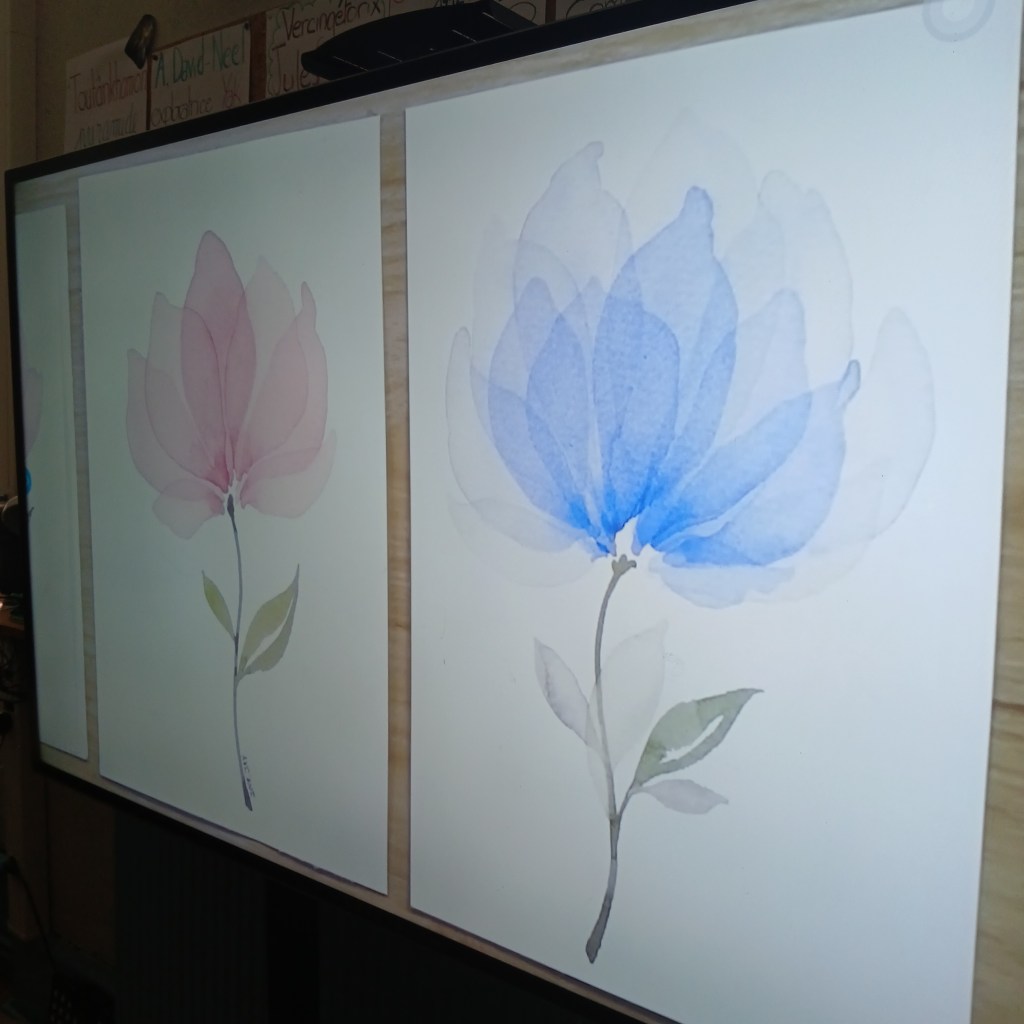 La série des « 100% », notamment les aquarelles monochromes, rencontre un succès fou chez mes élèves : le rendu est spectaculaire, même avec un geste encore maladroit, et cela leur donne une grande satisfaction de voir leur production exposée.