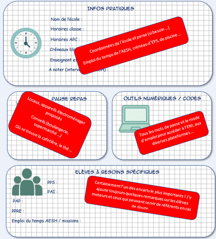 • Infos pratiques : horaires de classe et d’APC, coordonnées, créneaux bloqués, intervenants/AESH, accès, outils numériques, codes …