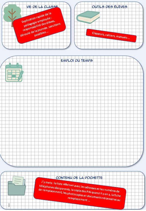 L’objectif de cette pochette est simple : garantir une prise en main sereine de la classe en cas d’absence, tout en affirmant que le remplaçant est un professionnel pleinement digne de confiance. Je fournis donc un cadre très structuré qu’il peut suivre s’il le souhaite, sans rien lui imposer dans sa manière d’enseigner.