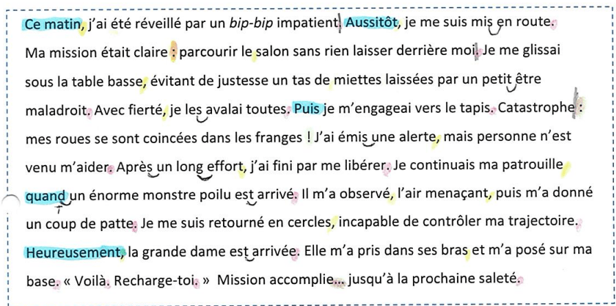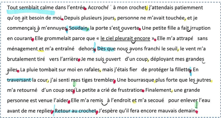 Grâce à un code couleur (rouge, vert ou jaune), les enfants identifient les endroits où ils maintiennent le ton, monte ou descente. Ils identifient les liaisons et les différentes articulations des étapes du texte.