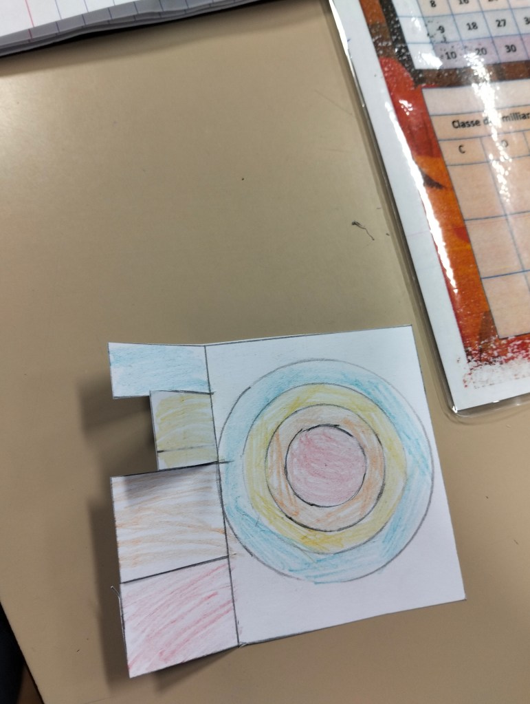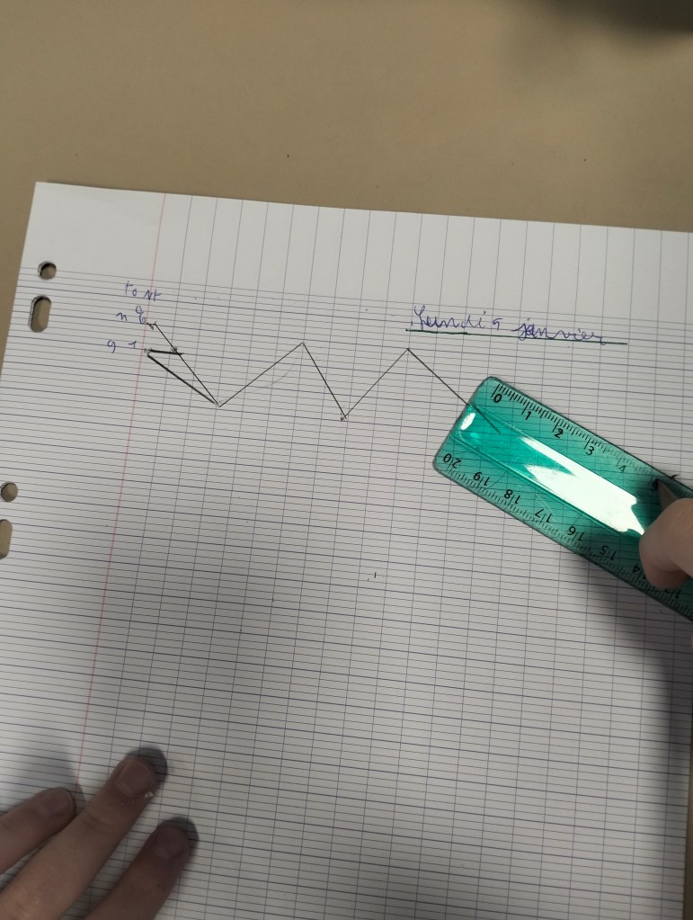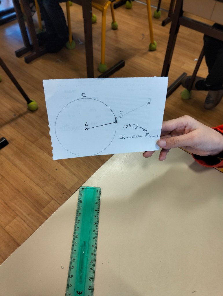 9h : présentation du rituel géométrie du vendredi : suivre un petit programme de construction, rapide sur le papier. Sauf qu’avant… il faut partager la feuille en 4. Et là, je me suis fait avoir. Encore. Ça a pris un temps fou. Comme quoi, “simple” ne veut pas toujours dire “rapide”.