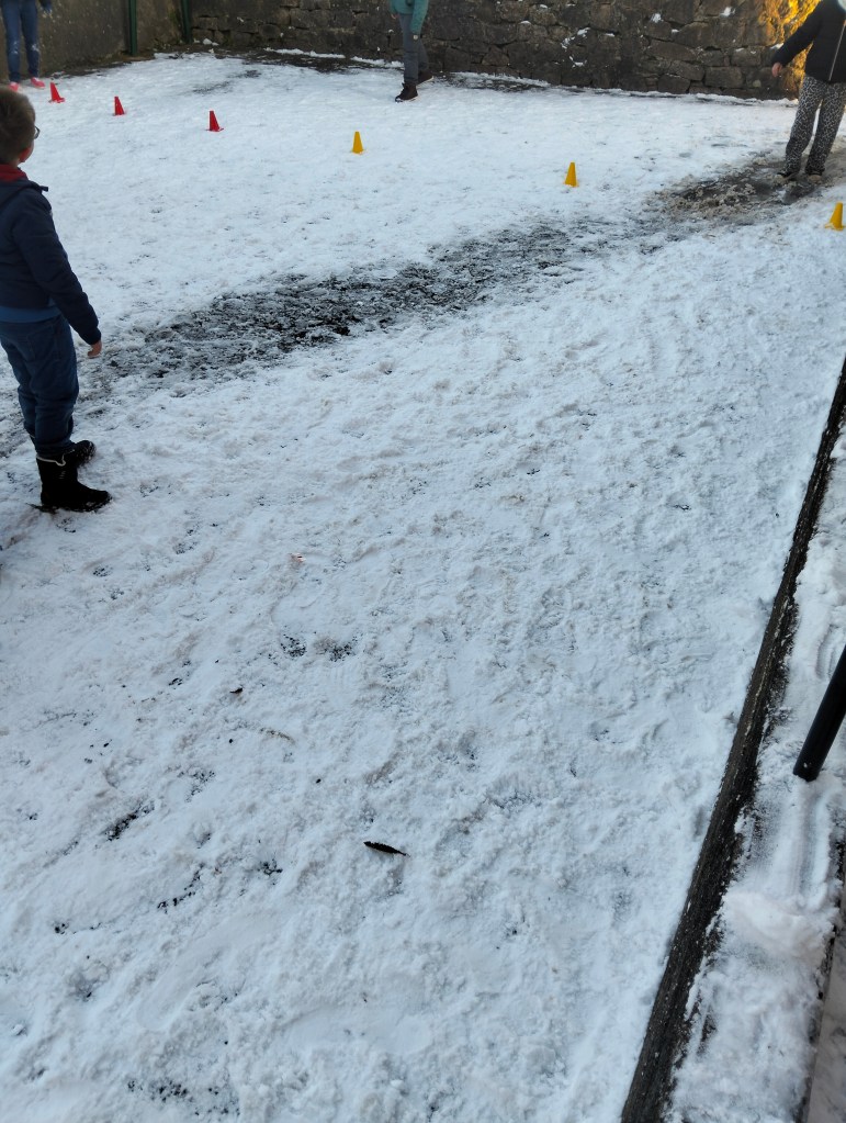 À 9h30, récréation. Des bonshommes de neige poussent un peu partout. Ils ont beaucoup de mal à rentrer. Qui les en blâmerait ? Eh bien moi. Parce que je suis gelée et que l’humidité n’est pas exactement l’alliée d’un dos en vrac.