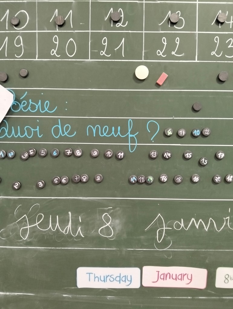 8h15. Dix minutes de retard déjà. C’est le vrai début de la journée. Bonne année, présentation des nouveautés, découverte du présentoir de livres, rituel de géométrie, échanges de privilèges…
